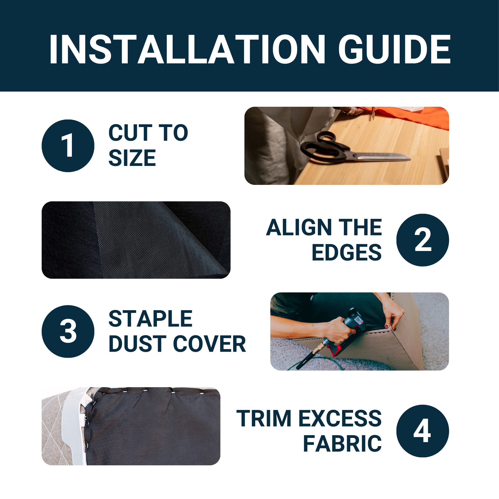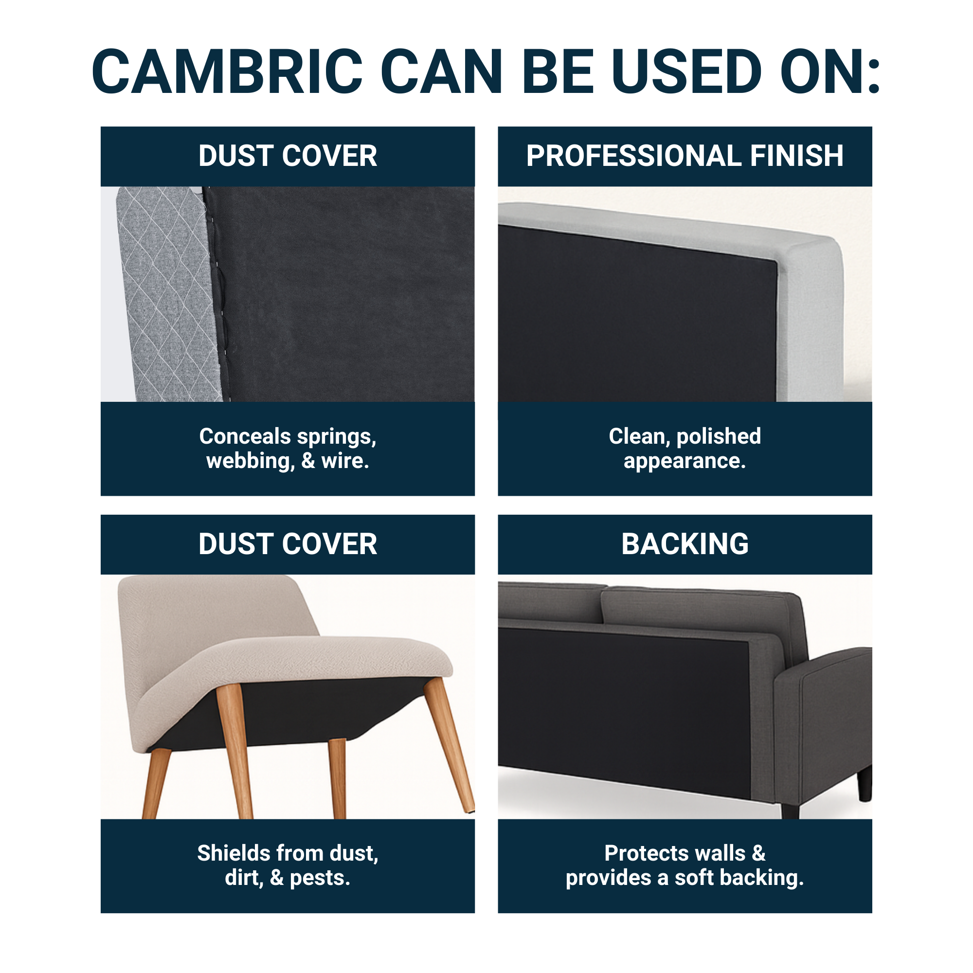This multi-purpose fabric is primarily an ideal replacement for mattress foundation covers. However, it can also be used on the back of bed headboards to provide a softer backing and help protect the wall. Choosing this fabric allows you to tackle your box spring repair yourself for a fraction of the cost of replacing the entire foundation.